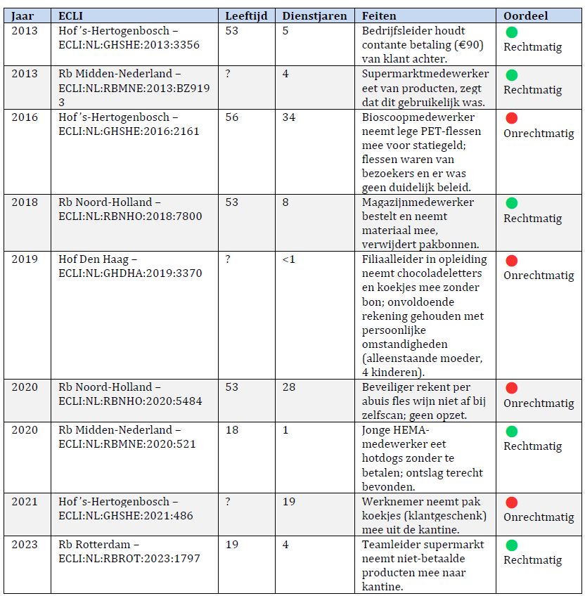 Een overzicht van ontslagen op grond van bagateldelicten door werknemers, inclusief samenvattende tabel wanneer een ontslag wel, en wanneer het niet stand heeft gehouden.