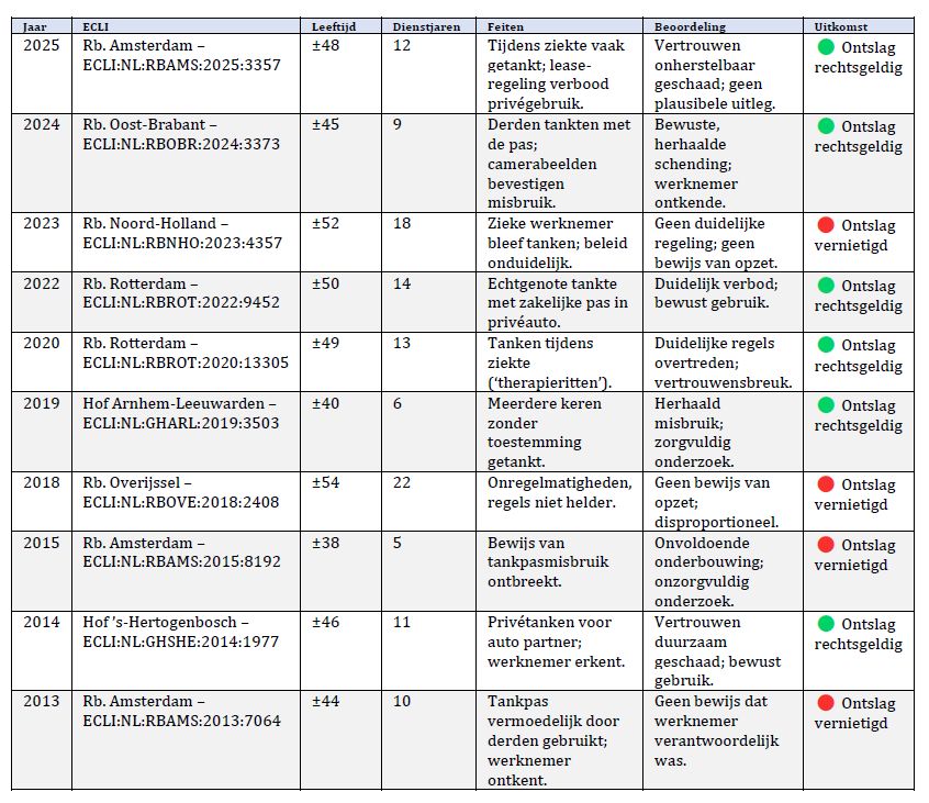 Een overzicht van ontslagen op staande voet wegens misbruik van zakelijke tankpassen door werknemers. Inclusief samenvattende tabel wanneer een ontslag wel, en wanneer het niet stand heeft gehouden.